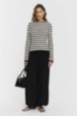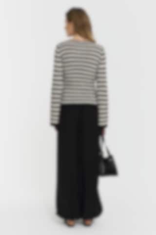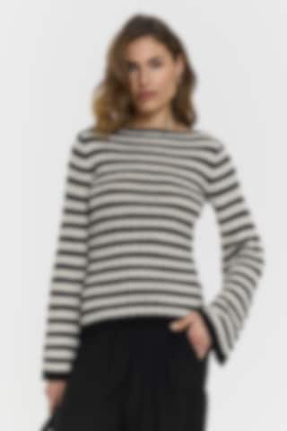 The Karlie Knitted Top features a boat neckline and subtle trumpet sleeves for a modern, refined look. The ribbed knit and striped design lend it an effortless sophistication, making it a comfortable piece for everyday wear.
